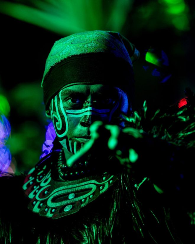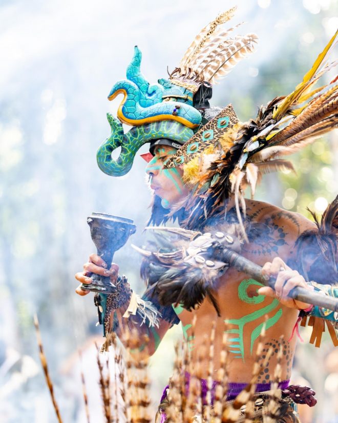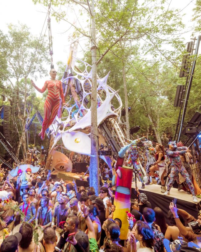 Moving between stages, ritual elements quietly threaded the night together. Figures in ceremonial, Mayan-inspired dress moved calmly through the crowd, cleansing dancers with smoke as people paused and leaned in. At El Teatro, Zombie Affair’s live set, the collaboration between Zombies in Miami and Mystery Affair, brought a loose, driving energy that locked the floor in place, the closeness of the space amplifying every shift in sound. Nearby, a bonfire burned at the heart of the grounds, becoming a natural point of return between sets, a place to reset and take in the scale of what was unfolding around it.
